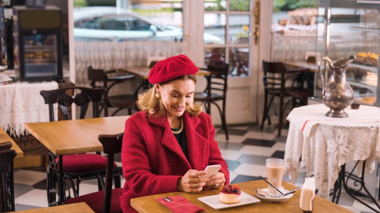 Waiting in cafe. Beautiful mature elegant lady texting her husband while waiting for him in cafe